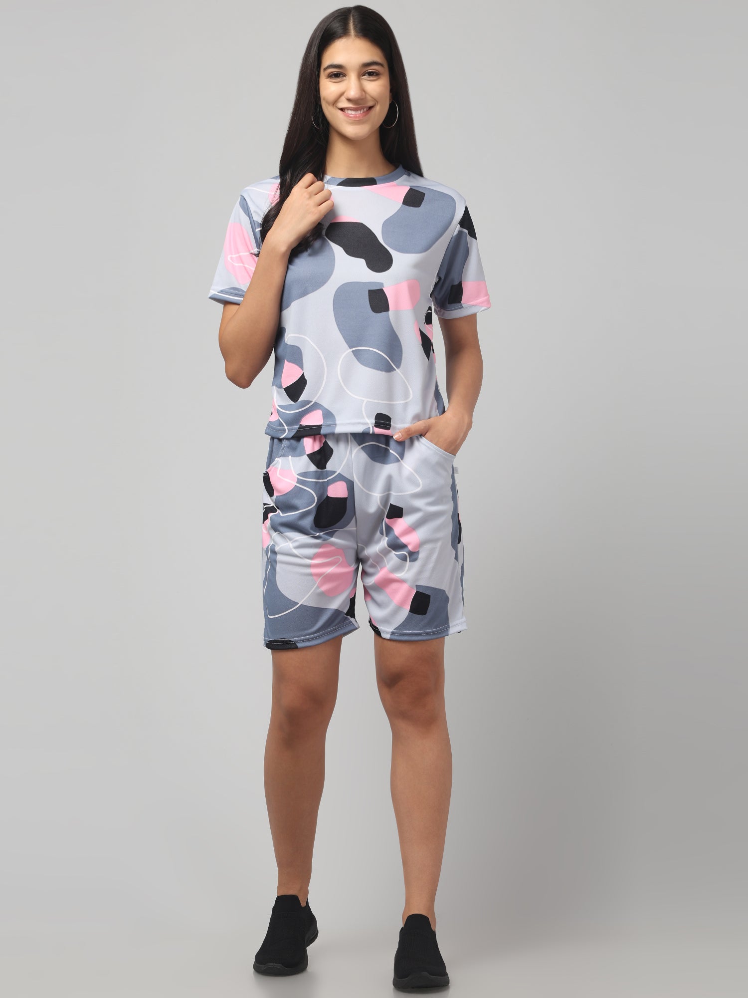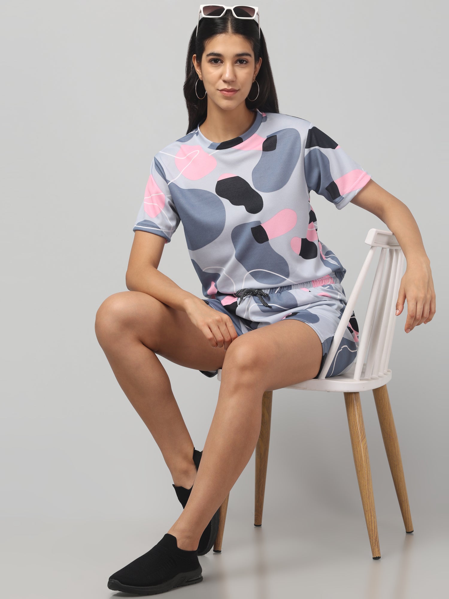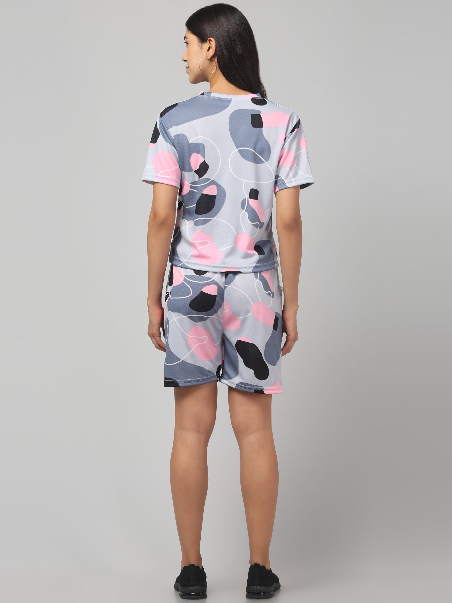 Sleep in style with our Soft Shapes Night Shorts Set, designed to keep you cool and comfortable all night long. Featuring a modern abstract print in soft grey, pastel pink, and deep black tones, this nightsuit offers a trendy twist on classic bedtime wear.